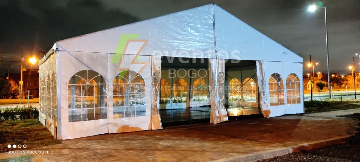 Ideal para cumpleaños, aniversarios y reuniones familiares de tamaño medio. Incluye estructura, lonas y montaje básico en Bogotá.